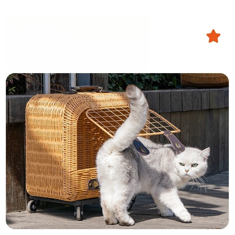 Wicker Rattan Cat Carrier Rolling Trolley Suitcase Breathable Mesh Portable Travel Crate Telescopic Handle Quiet 360 Lightweight