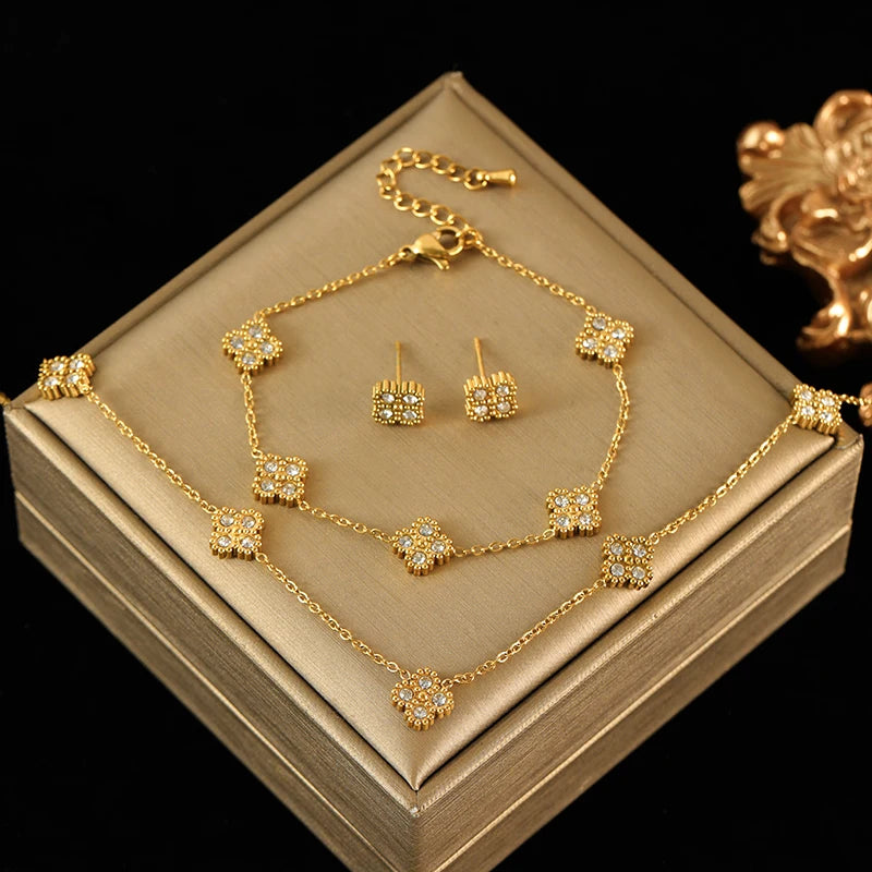 Add a touch of sparkle to any outfit with this stylish flower-inspired necklace, bracelet, and earrings set – perfect for parties, birthdays, or special occasions.