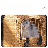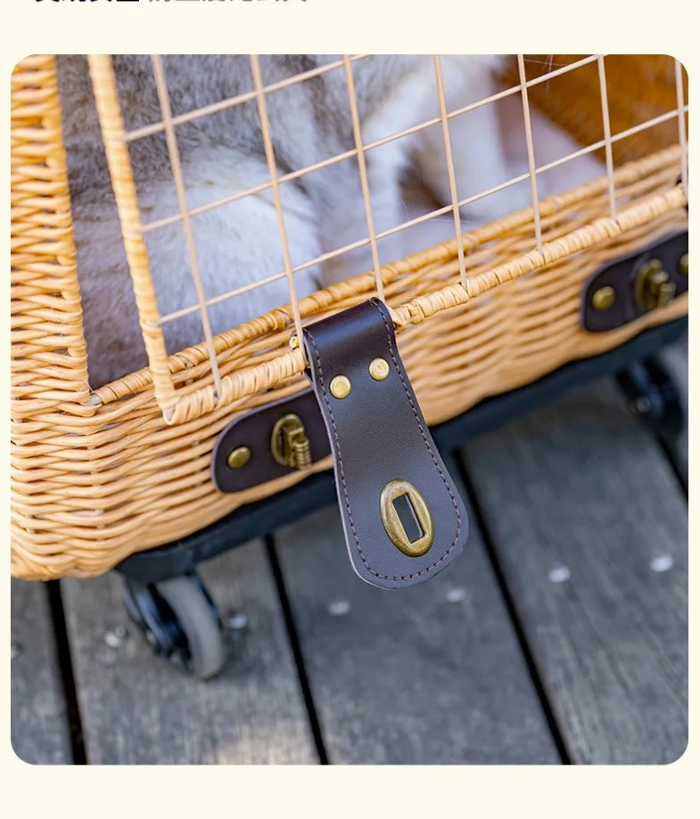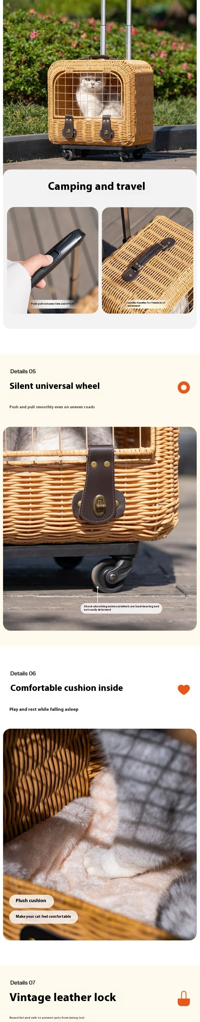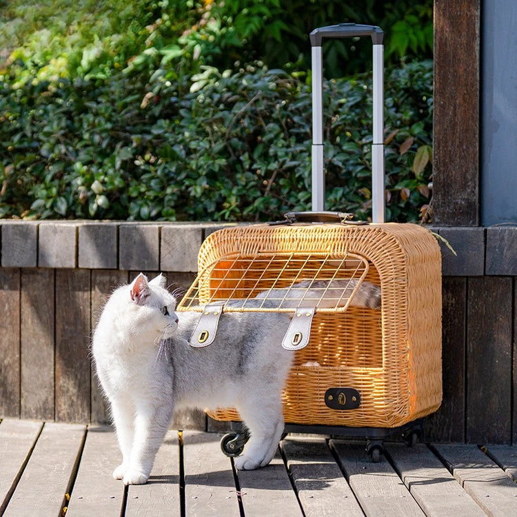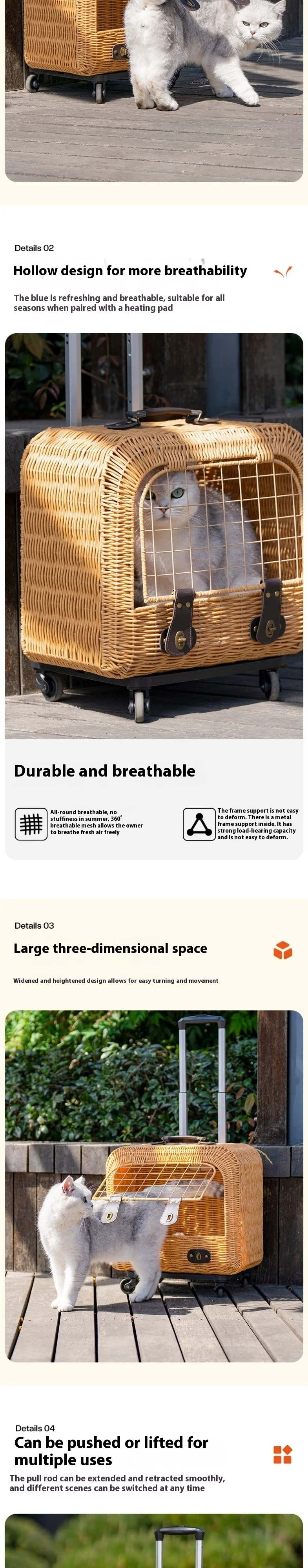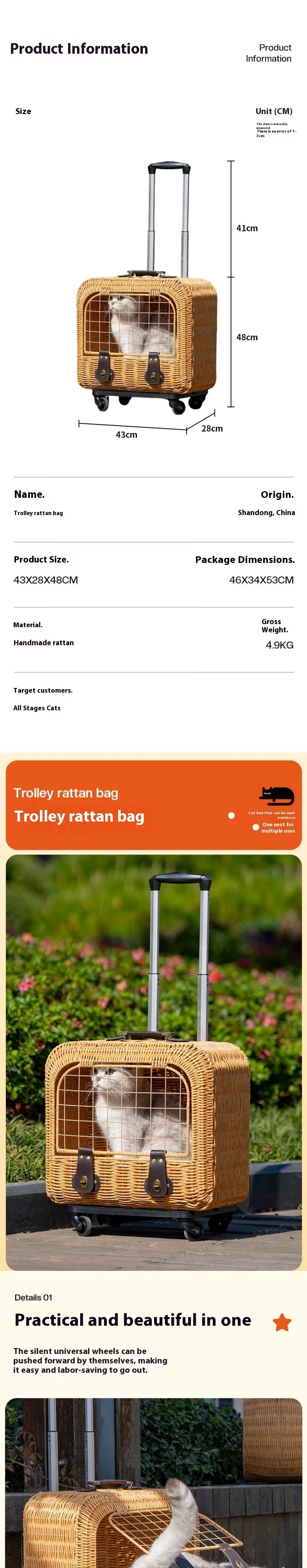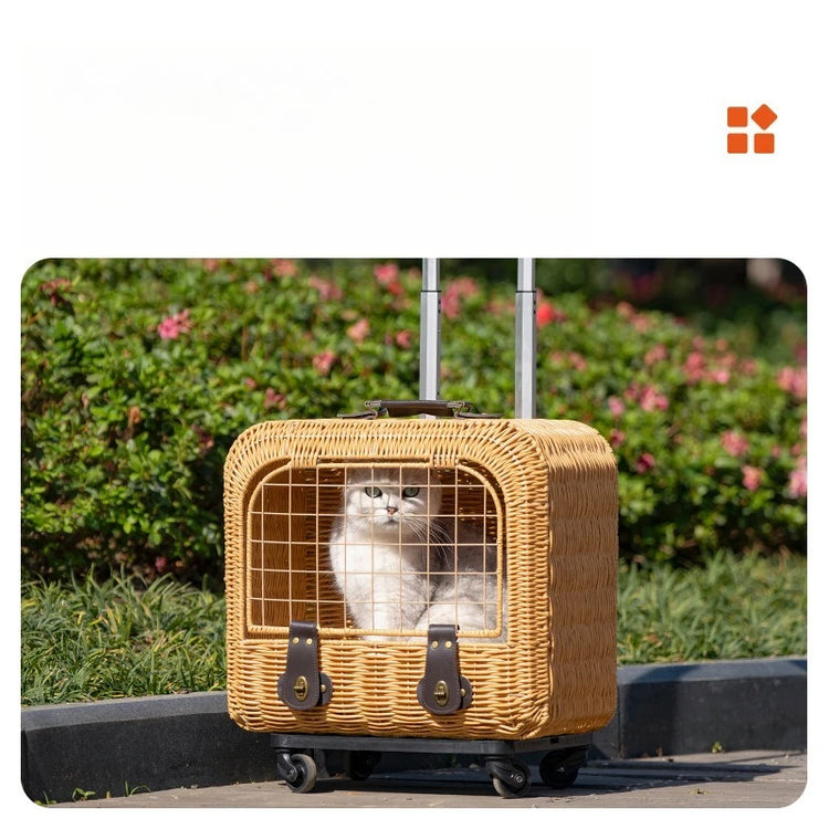 Wicker Rattan Cat Carrier Rolling Trolley Suitcase Breathable Mesh Portable Travel Crate Telescopic Handle Quiet 360 Lightweight